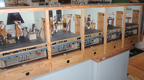 BIRMINGHAM MUSEUM AND ART GALLERY : PROJECT : To make a series of workshops showing the manufacturing processes of a flintlock rifle . A mechanical walking man visits each workshop in turn , as he walks into each workshop the scenes operate . Click here for a video. g |